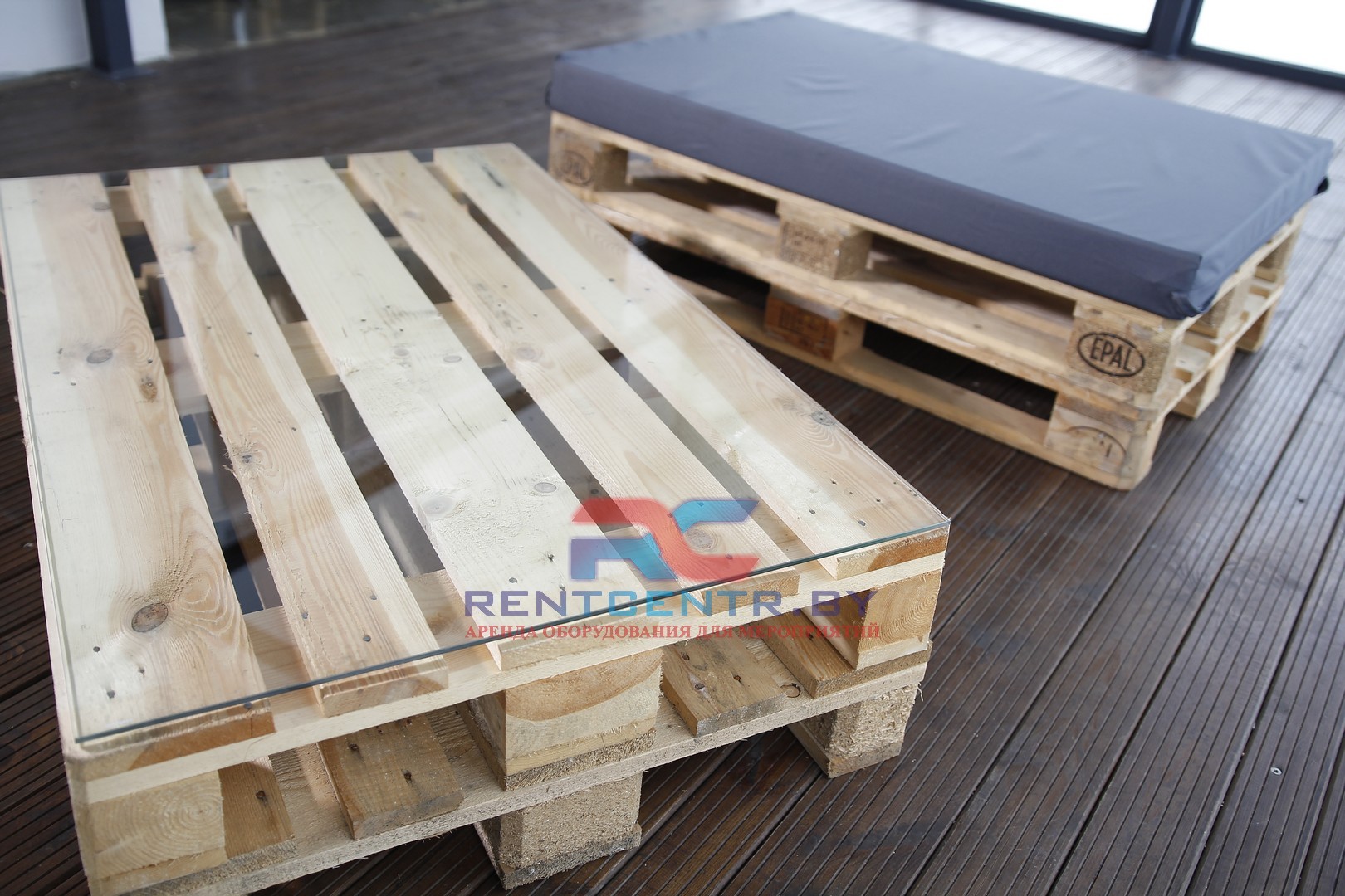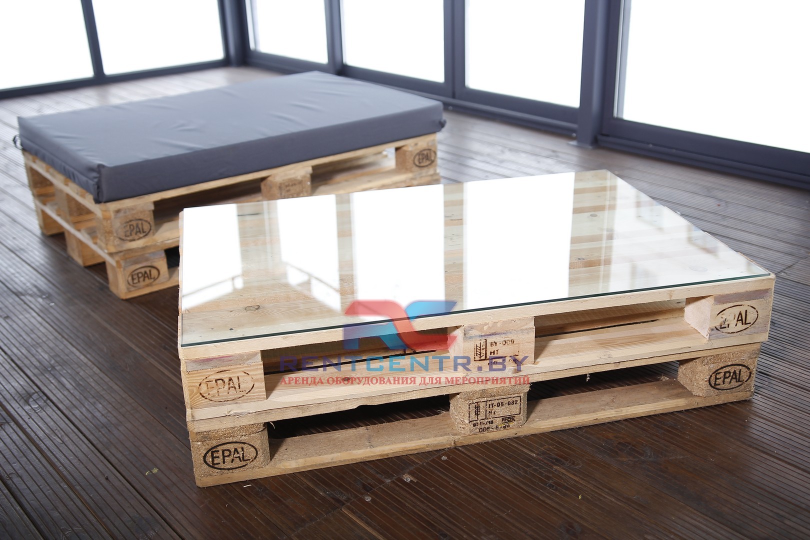 Предлагаем в аренду компактный и стильный журнальный стол из паллет. Он дополнит интерьер в стиле лофт, кантри, а также отлично будет сочетаться с угловым диваном из поддонов.