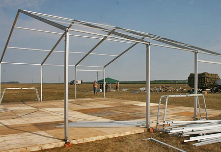За неимением возможности смонтировать шатер на ровной подходящей поверхности, популярным стало использование напольного покрытия. Оно представляет собой деревянный настил, укладываемый на деревянные брусья. Такой пол легко собирается прямо на нужном месте, привлекательно выглядит и является очень практичным и удобным.