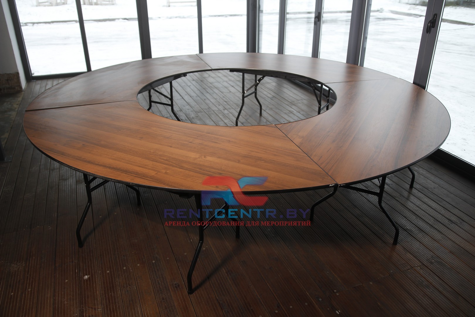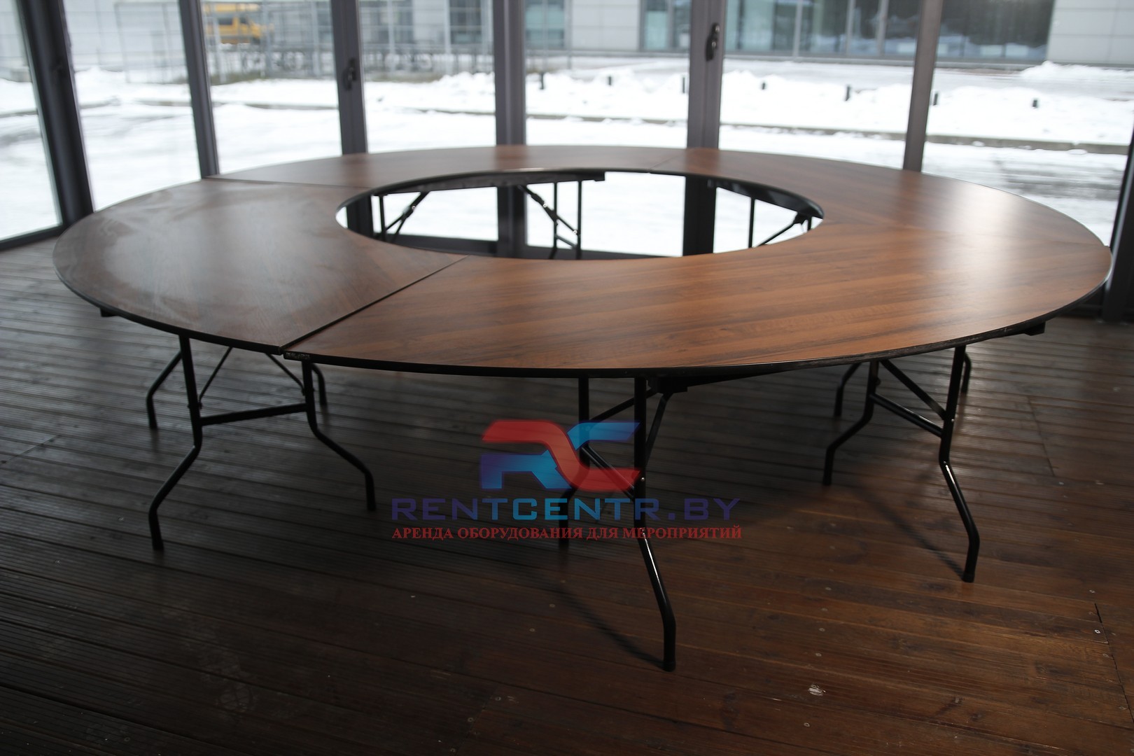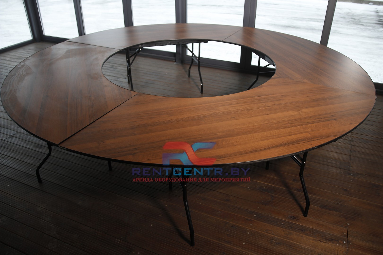 Составные столы необычайно удобны за счет того, что позволяют вместить большое количество человек. Особенность конструкции такова, что элементы, входящие в комплект, могут располагаться как угодно, придавая мебели любую форму. Компания «Рентцентр» предоставляет в аренду стол «Конференц-круг» на выгодных условиях.