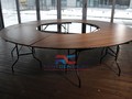Данный составной стол выполнен в форме круга, что обеспечивает максимальную вместительность приглашенных гостей. При желании можно расставить элементы, изменив конструкцию. Столешница изготовлена из ЛДСП цвета орех, а каркас – из прочного металла с порошковым покрытием черного цвета. Такой дизайн впишется в любой формат мероприятия, а складная конструкция обеспечит удобное хранение и перевозку.
