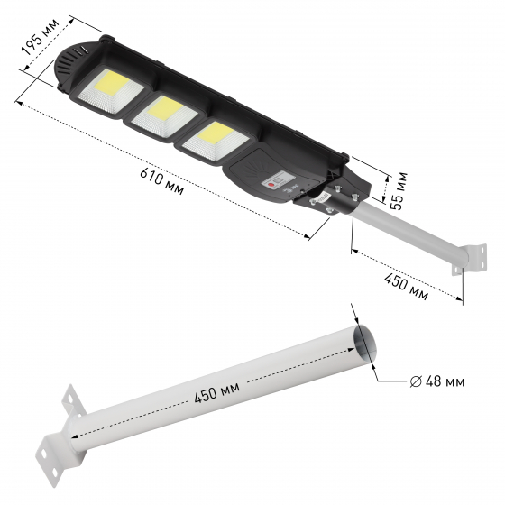 Консольные светильники предназначены для ночного освещения небольших площадей радиусом 10-15 м. Создаваемое свечение 1100 Лм. Мощность 60 W. Возможность использования в тех местах, где отсутствует доступ к централизованной элeктрической сети. Дистанционное управление для изменения режимов. Датчик движения. Комплект для установки и монтажа. Защита от влаги IP65.